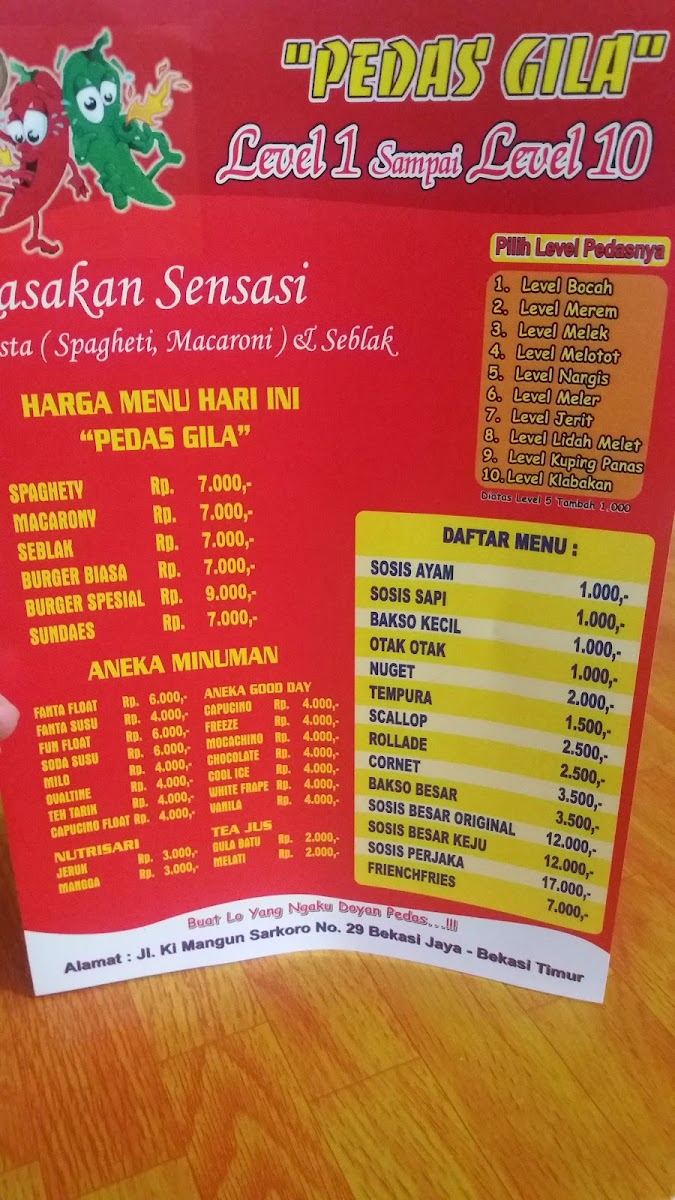 Welcome to Cafe Pedasgila, a vibrant hotspot located in the heart of Bekasi Utara. This charming cafe specializes in an array of spicy dishes that will tantalize your taste buds. The menu features an impressive selection of seblak, customizable to various spice levels, starting from mild at level 1 up to a fiery challenge at level 10, priced affordably at IDR 8,000. For those craving pasta, Cafe Pedasgila offers delectable spaghetti and macaroni options at just IDR 9,000.